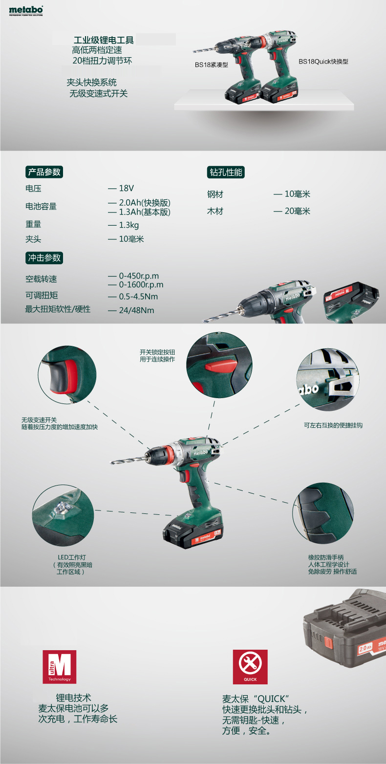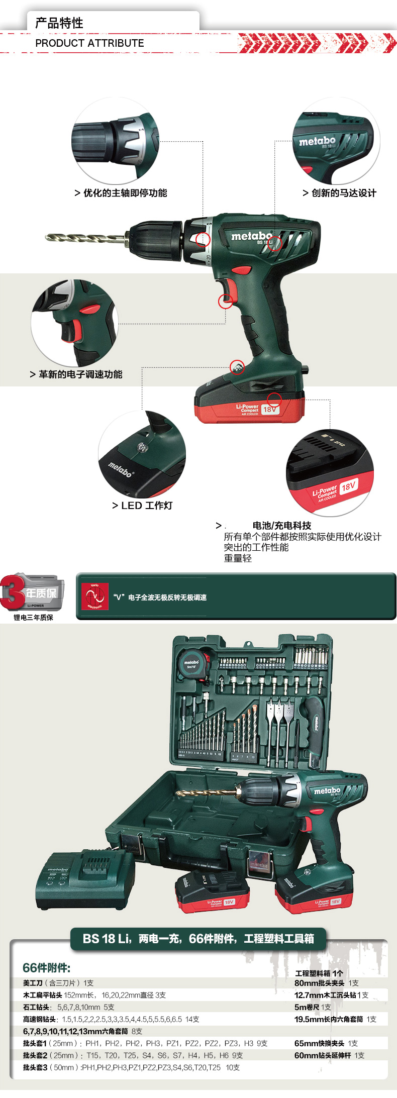商品名称:Metabo/麦太保 BS 18伏锂电电钻套装 66件家用工具套装带电钻 BS 18 Li Set