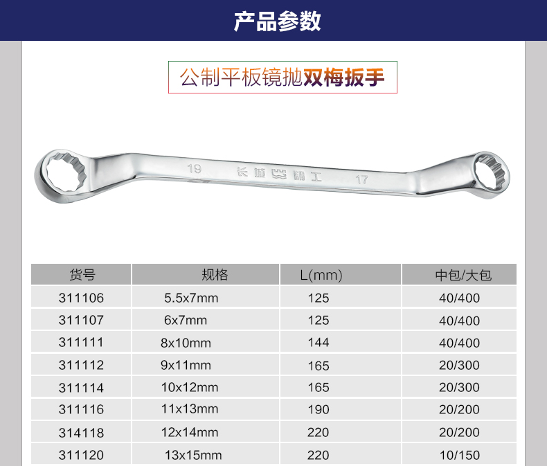商品名称:长城精工 梅花扳手公制镜抛双梅扳手多规格眼睛扳手汽机修闭口扳手 311126