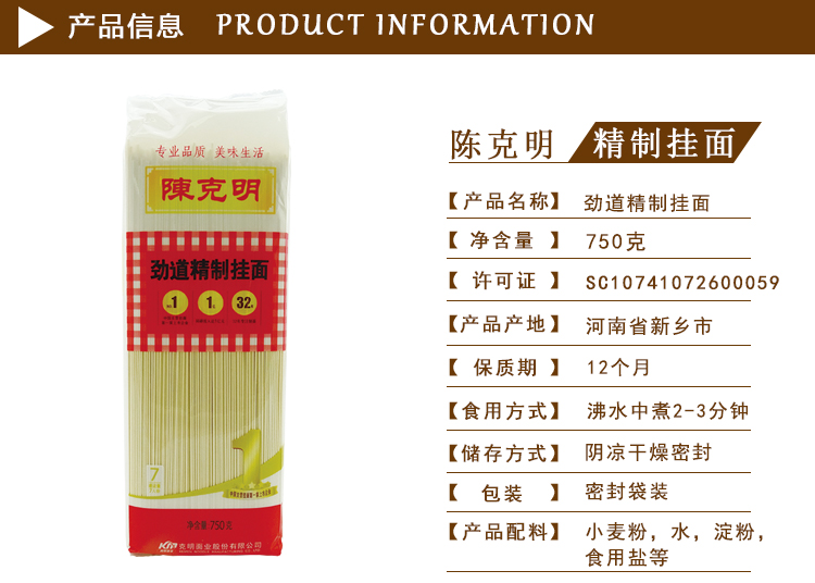商品名称:陈克明 劲道挂面 750g 包装 方便速食粗粮待煮面条 非油炸