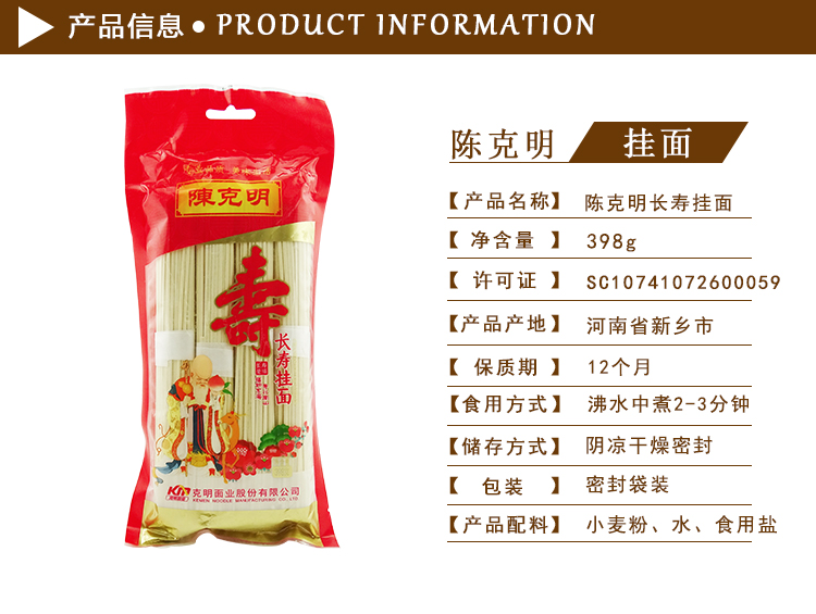 商品名称:陈克明 长寿挂面 398g 包装 方便速食粗粮待煮面条 非油炸