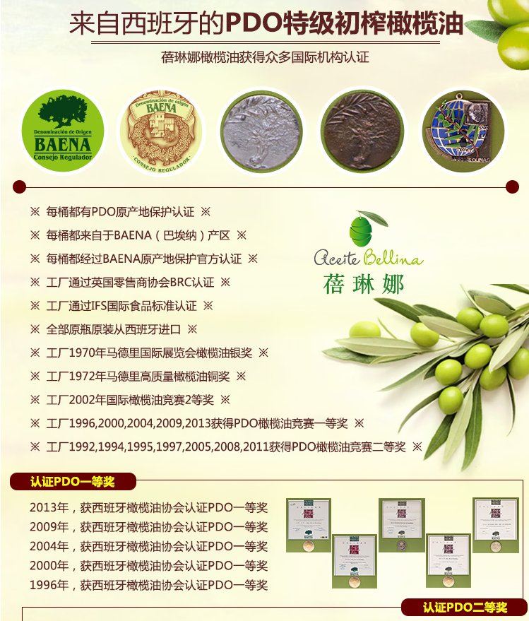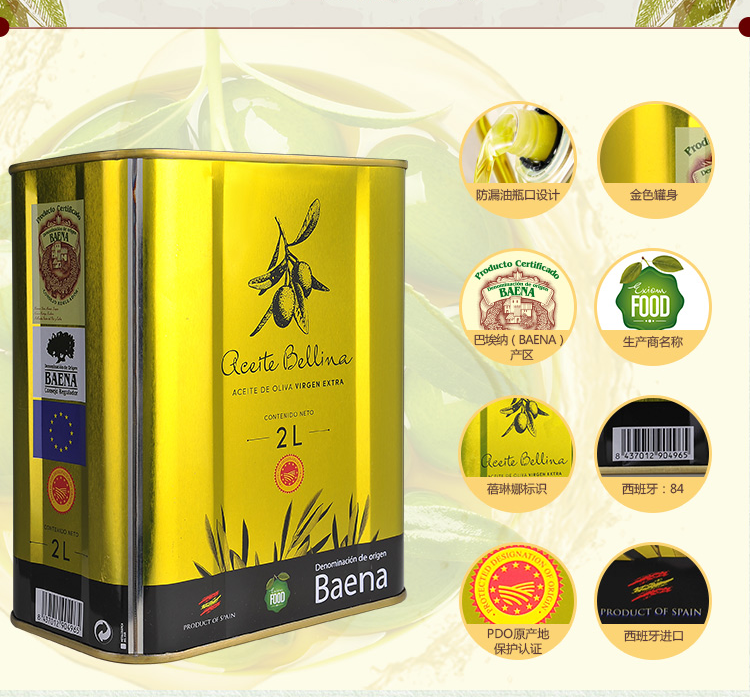 商品名称:蓓琳娜/BELLINA PDO 特级 初榨 橄榄油 2L 西班牙原装进口