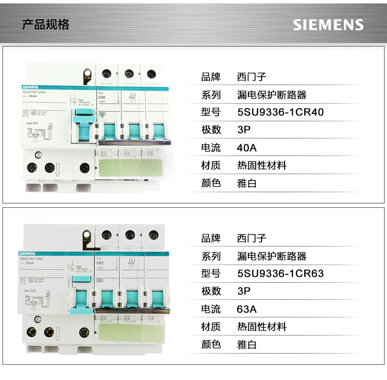 商品名称:西门子 3P漏电保护器40A漏保5SU93361CR40