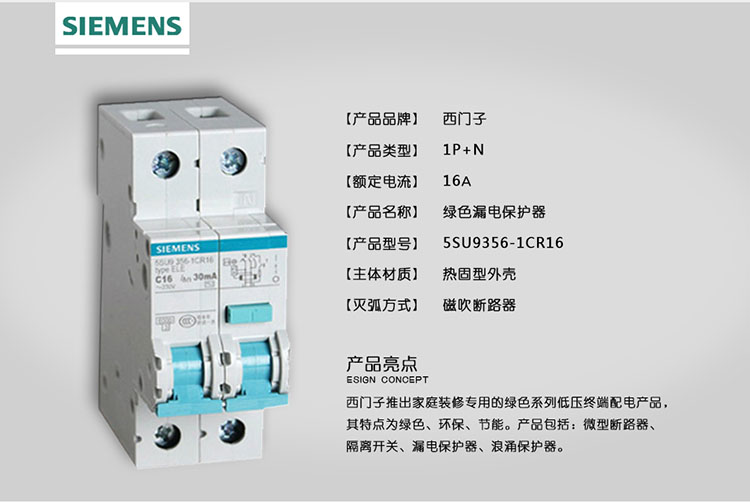 商品名称:西门子 漏电保护器 1P+N 16A 5SU93561CR16