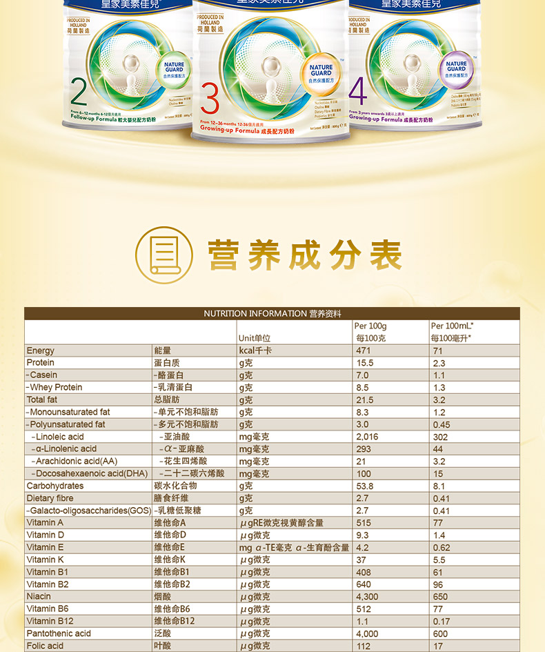 商品名称:皇家美素佳儿 港版 婴幼儿配方奶粉2段 800g*2罐