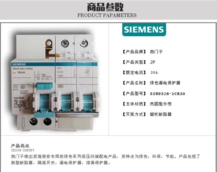 西门子 漏电保护器 2P 20A 5SU93261CR20