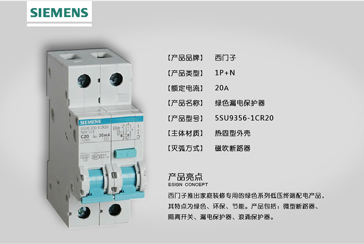 商品名称:西门子 漏电保护器 1P+N 20A 5SU93561CR20