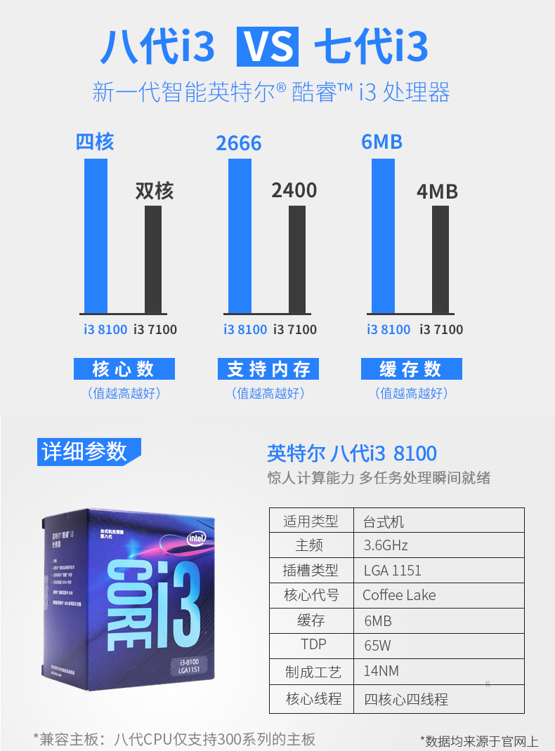 商品名称:Intel/英特尔 i3八代i3 8100 四核CPU处理器台式机电脑1151针盒装