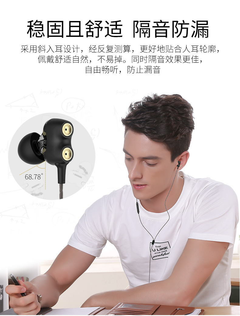 兰士顿 四核双动圈耳机入耳式有线HIFI超重低音炮通用魔音耳塞 D2