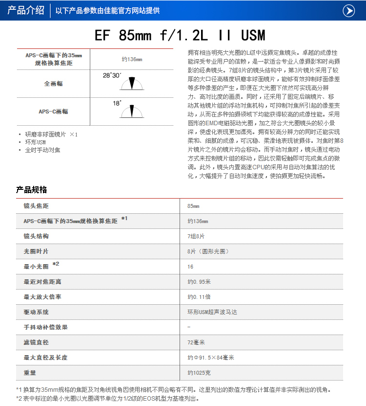 型号:EF 85mm f/1.2L II USM