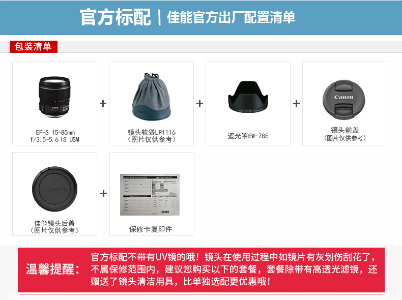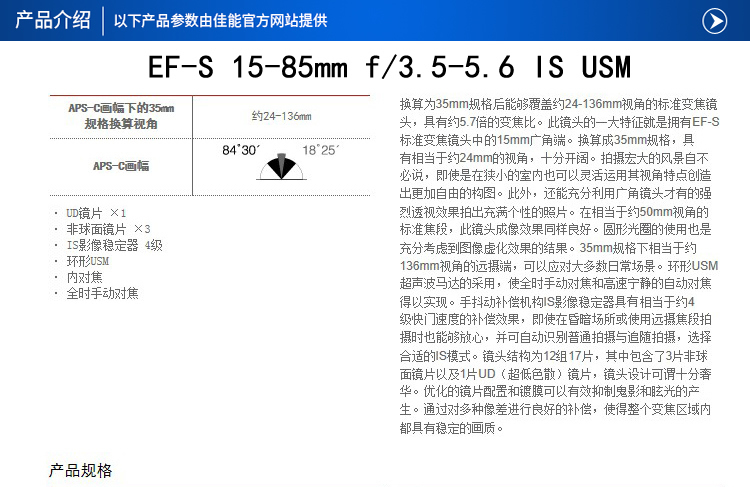 商品名称:佳能 15-85 广角变焦镜头 EF-S 15-85mm f3.5-5.6 IS USM