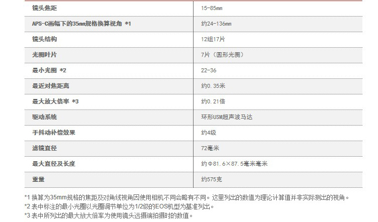 型号:EF-S 15-85mm/ f3.5-5.6 IS USM