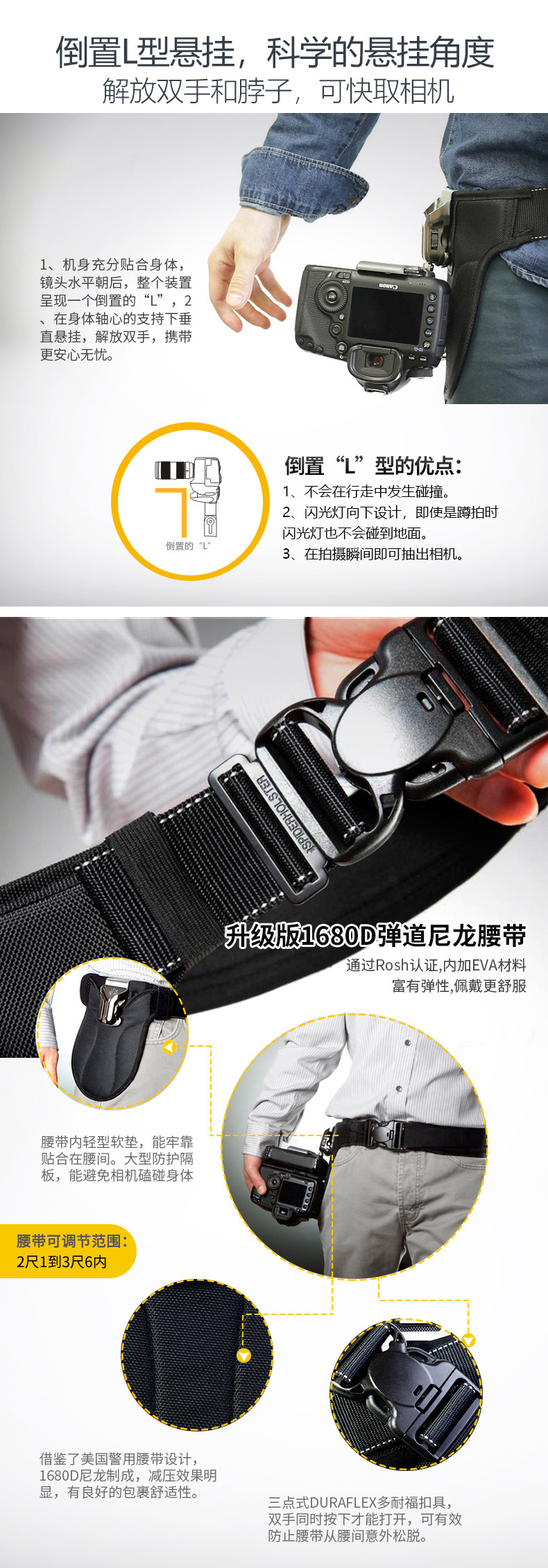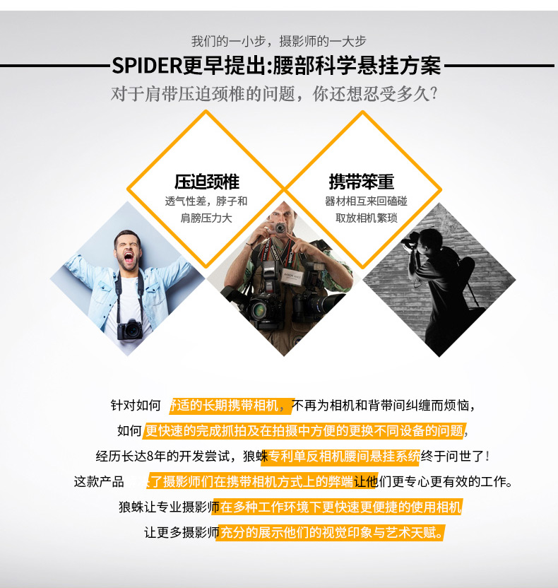 Spider狼蛛悬挂充分考虑到了摄影师的拍摄需求和人体工程学的特点。根据人体工程学人腰部是更能承受重量的部分。长时间佩戴人也不会感到特别的累。