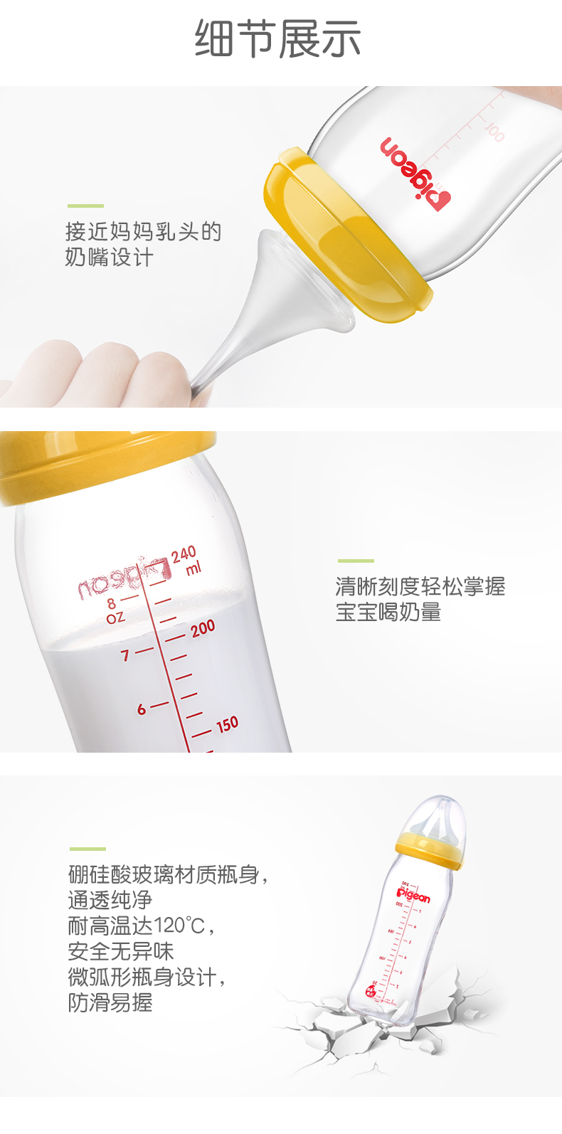 商品名称:贝亲 M号奶嘴奶瓶宽口径玻璃自然实感240ml 黄AA71/绿AA70