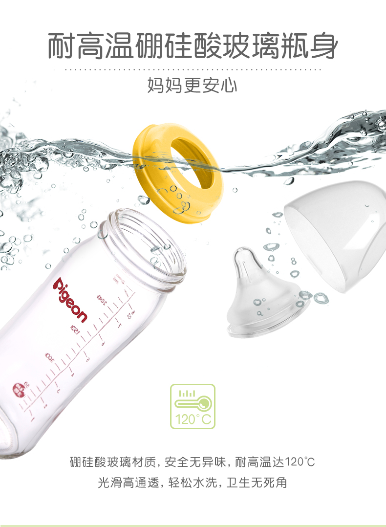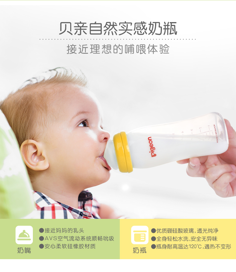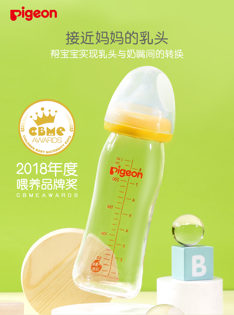 贝亲 M号奶嘴奶瓶宽口径玻璃自然实感240ml 黄AA71/绿AA70
