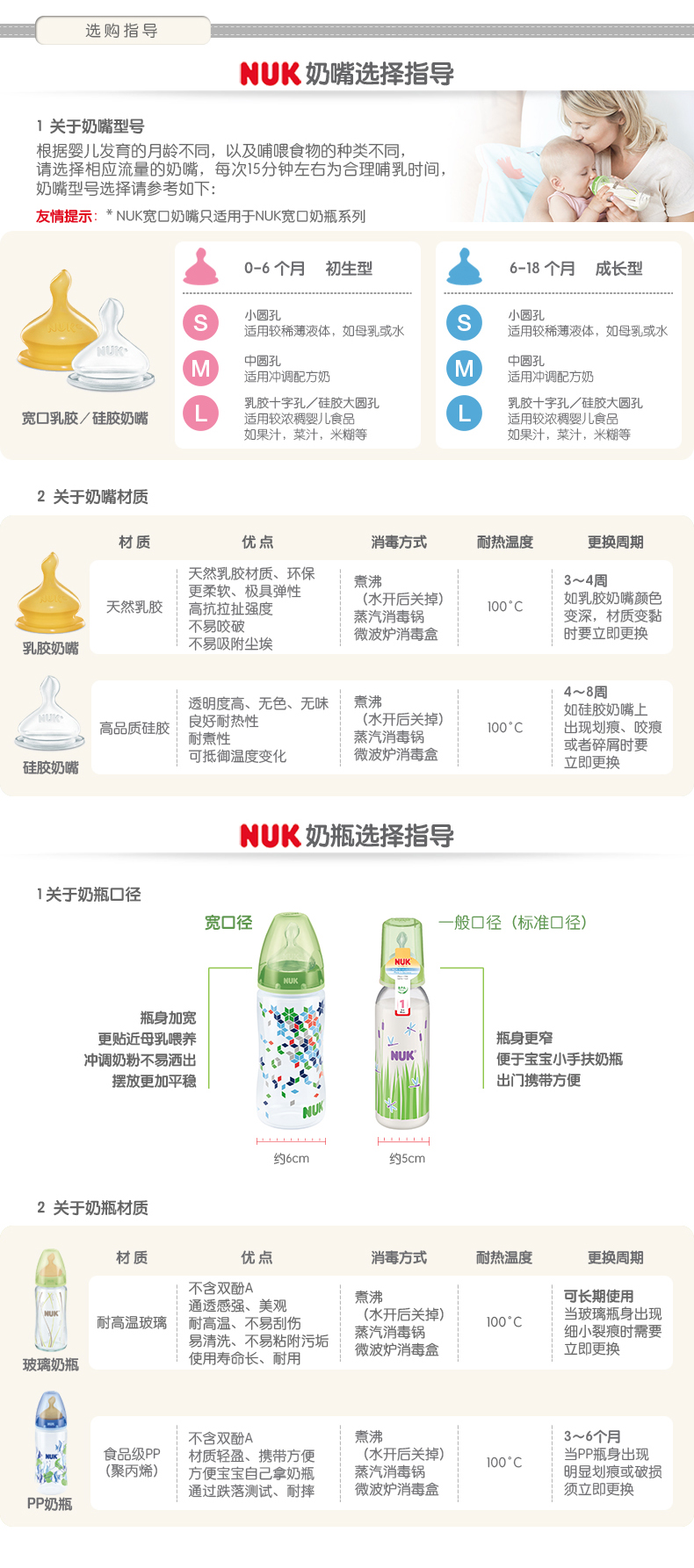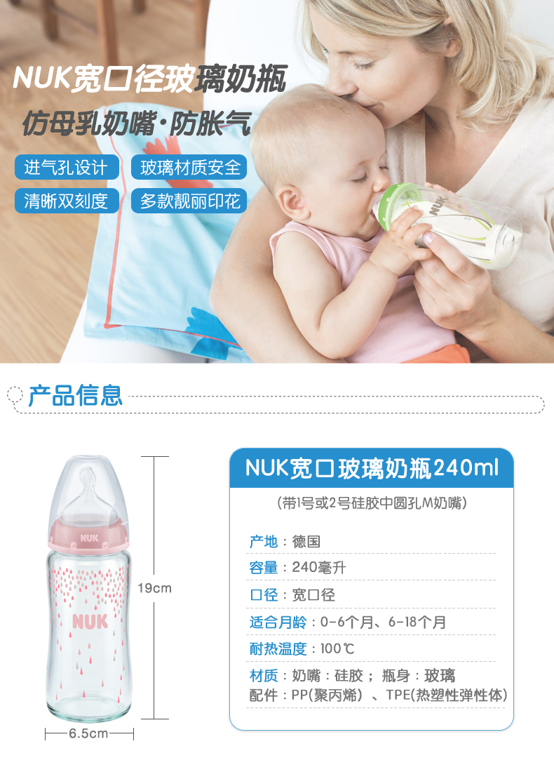 商品名称:德国NUK 奶瓶NUK宽口径彩色玻璃奶瓶240ml带硅胶奶嘴1号或2号奶瓶