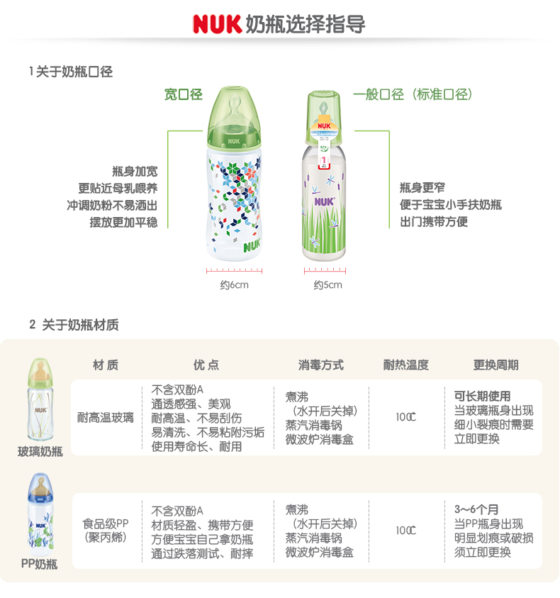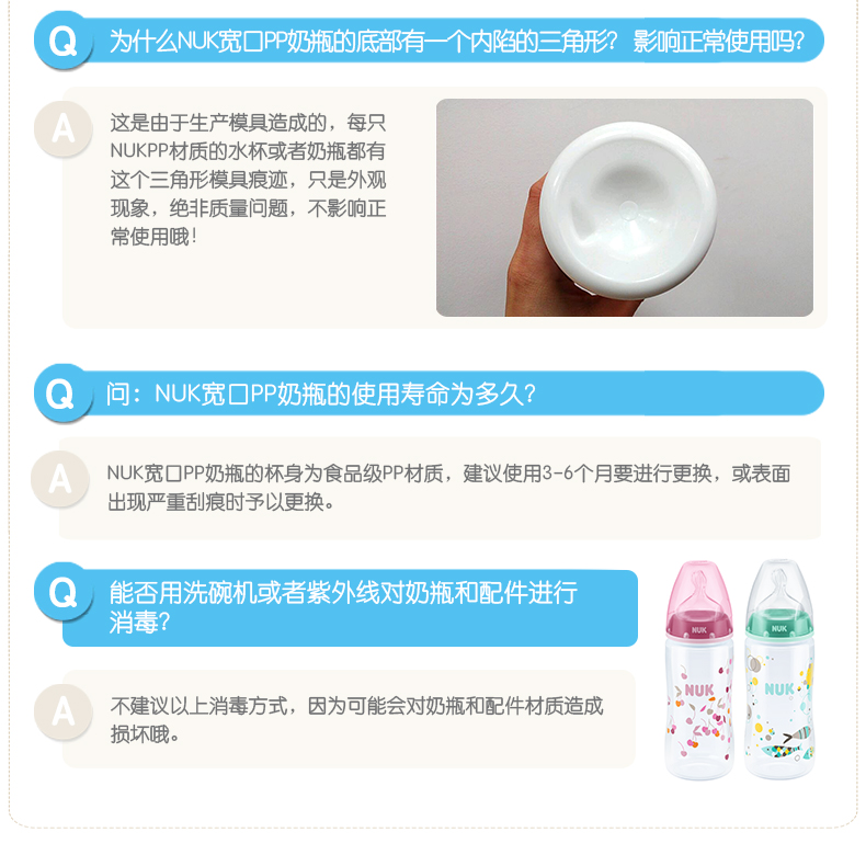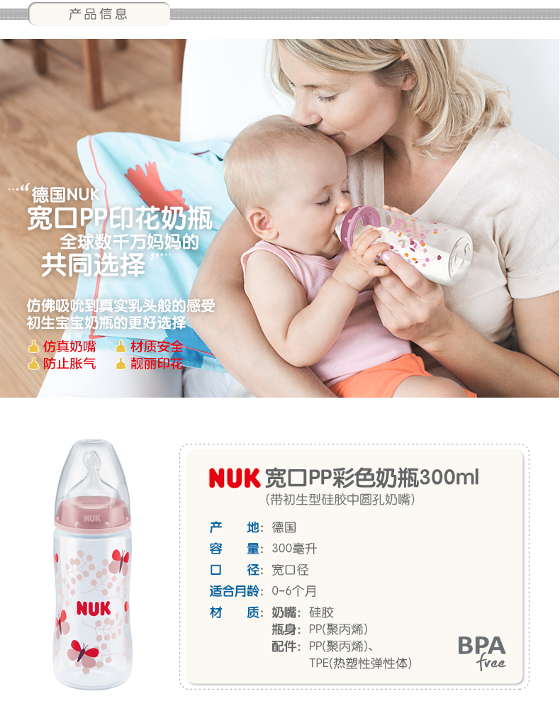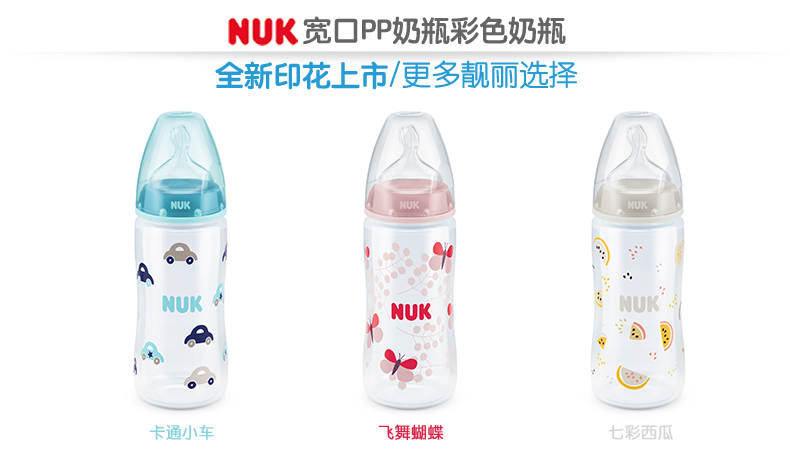商品名称:NUK 宽口PP彩色奶瓶300ml 带硅胶奶嘴1号中圆孔奶嘴
