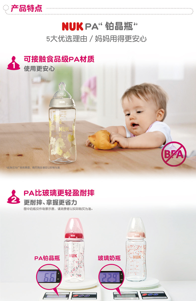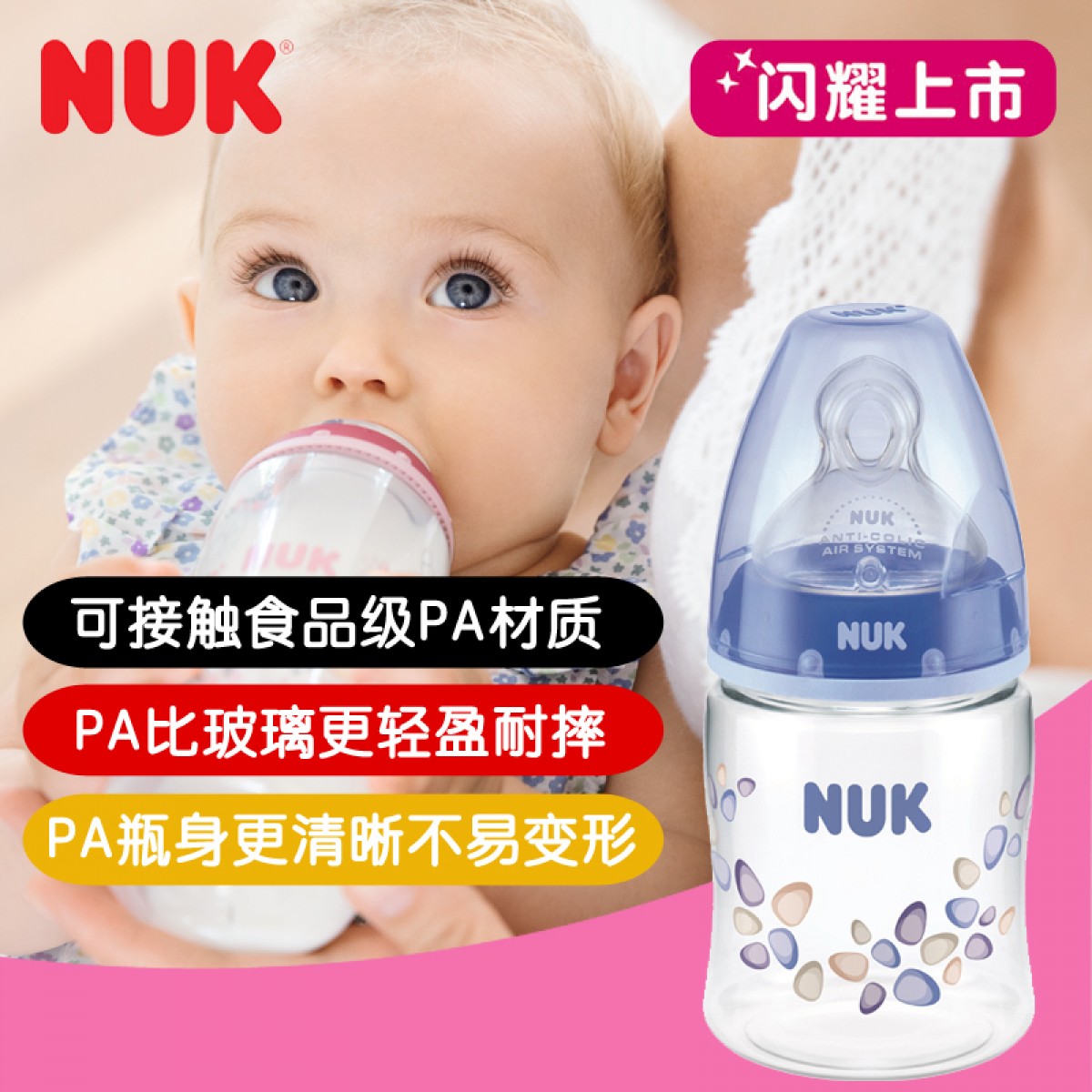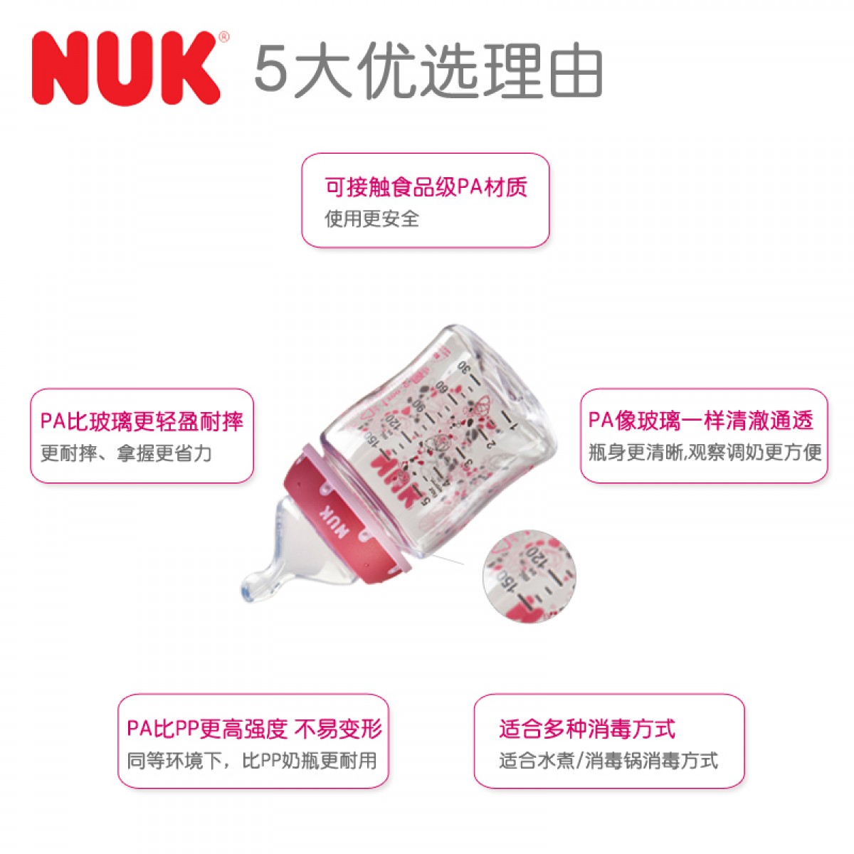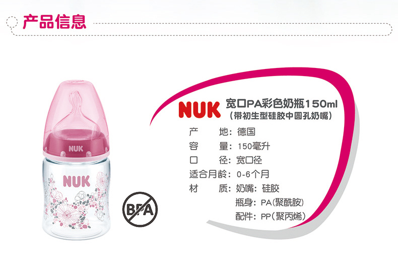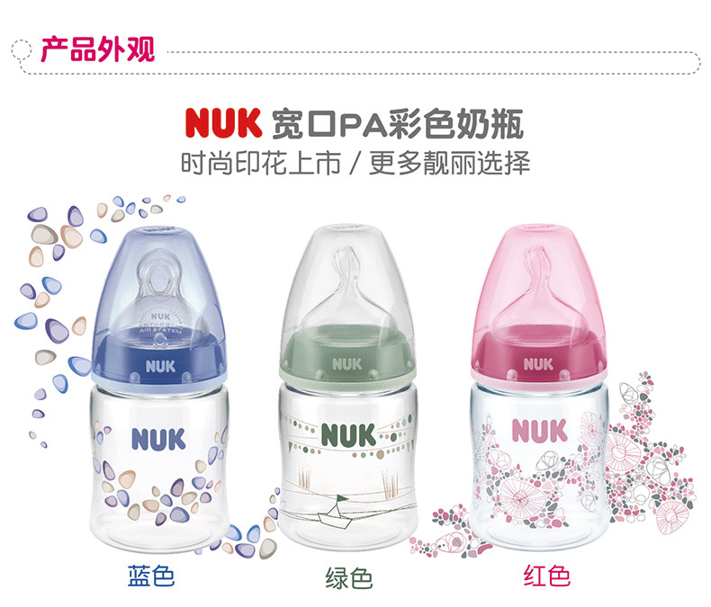 商品名称:NUK 150ml宽口径PA彩色奶瓶带初生型0-6个月硅胶中圆孔奶嘴