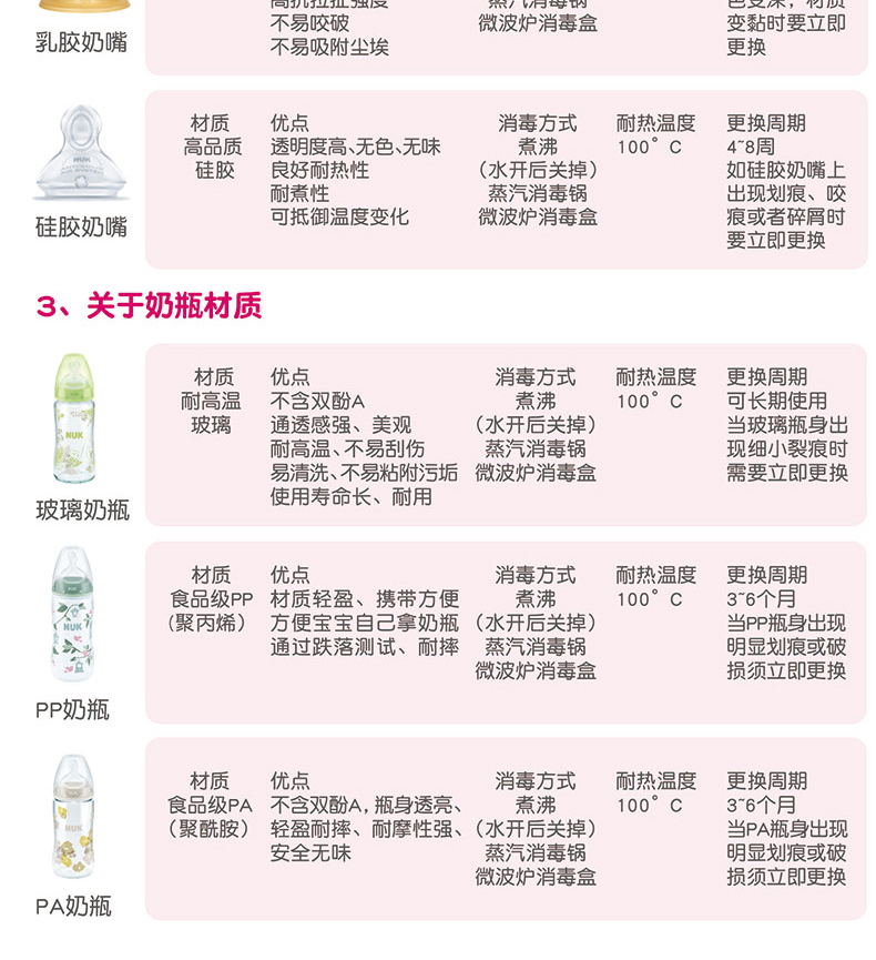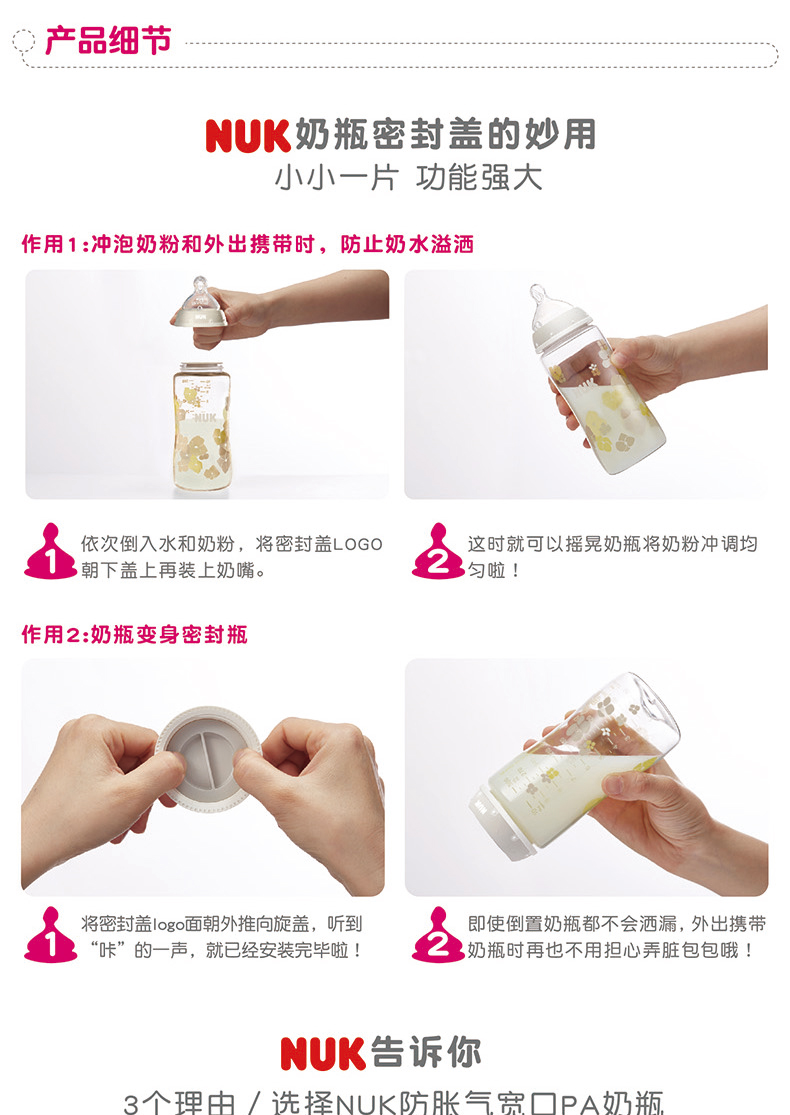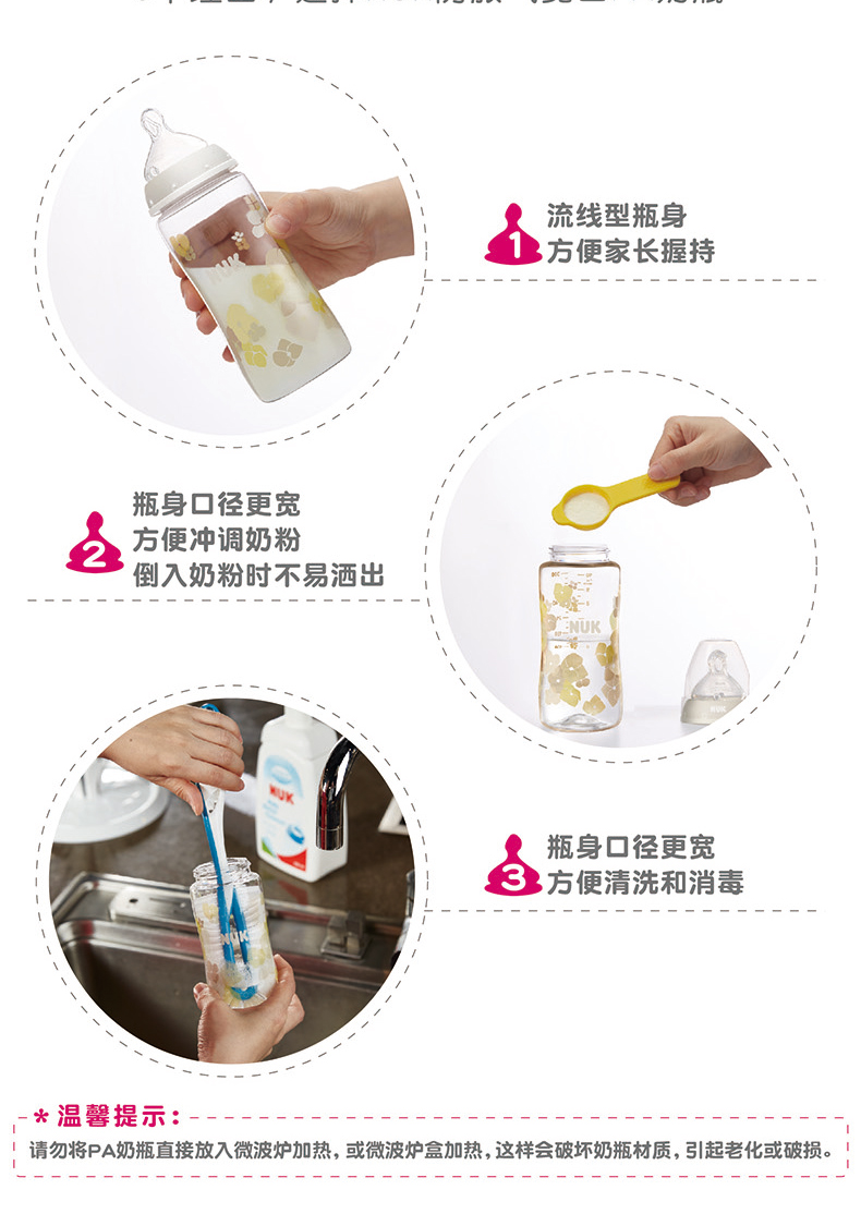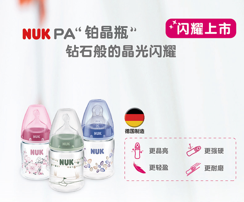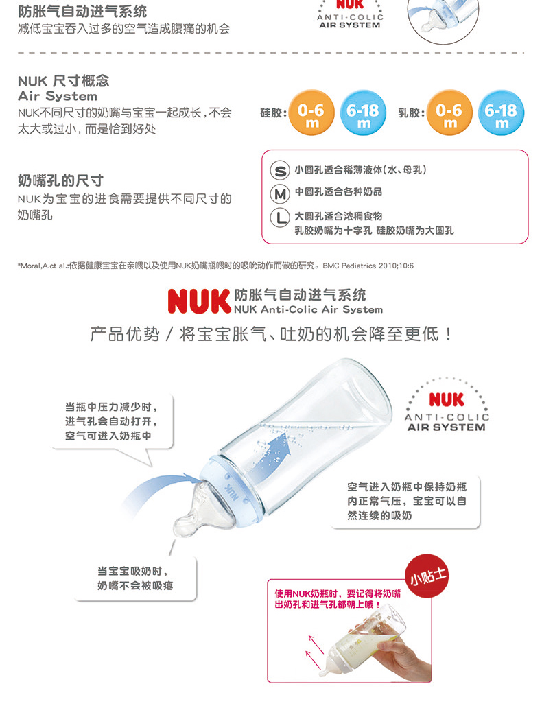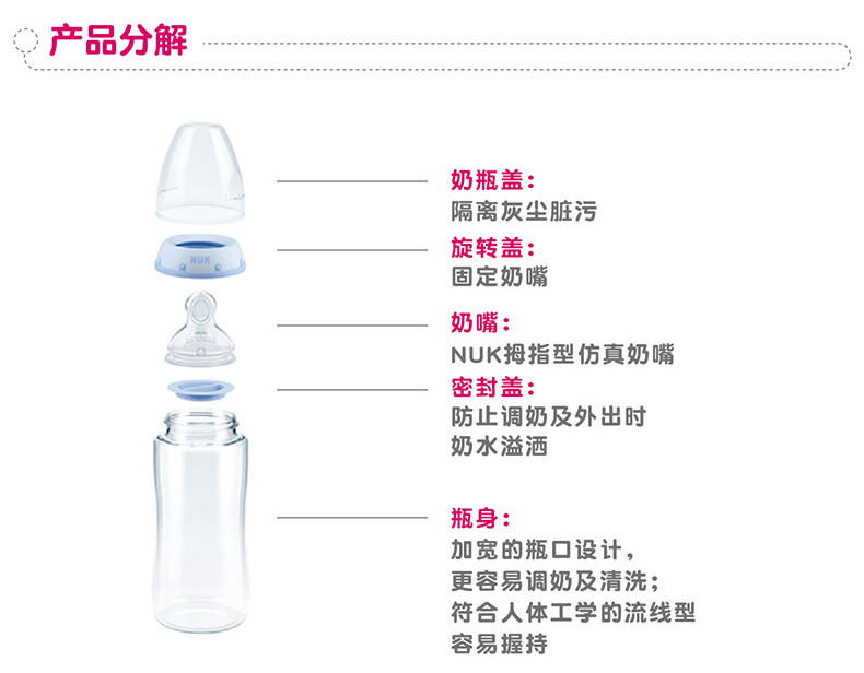 商品名称:NUK 150ml宽口径PA彩色奶瓶带初生型0-6个月硅胶中圆孔奶嘴