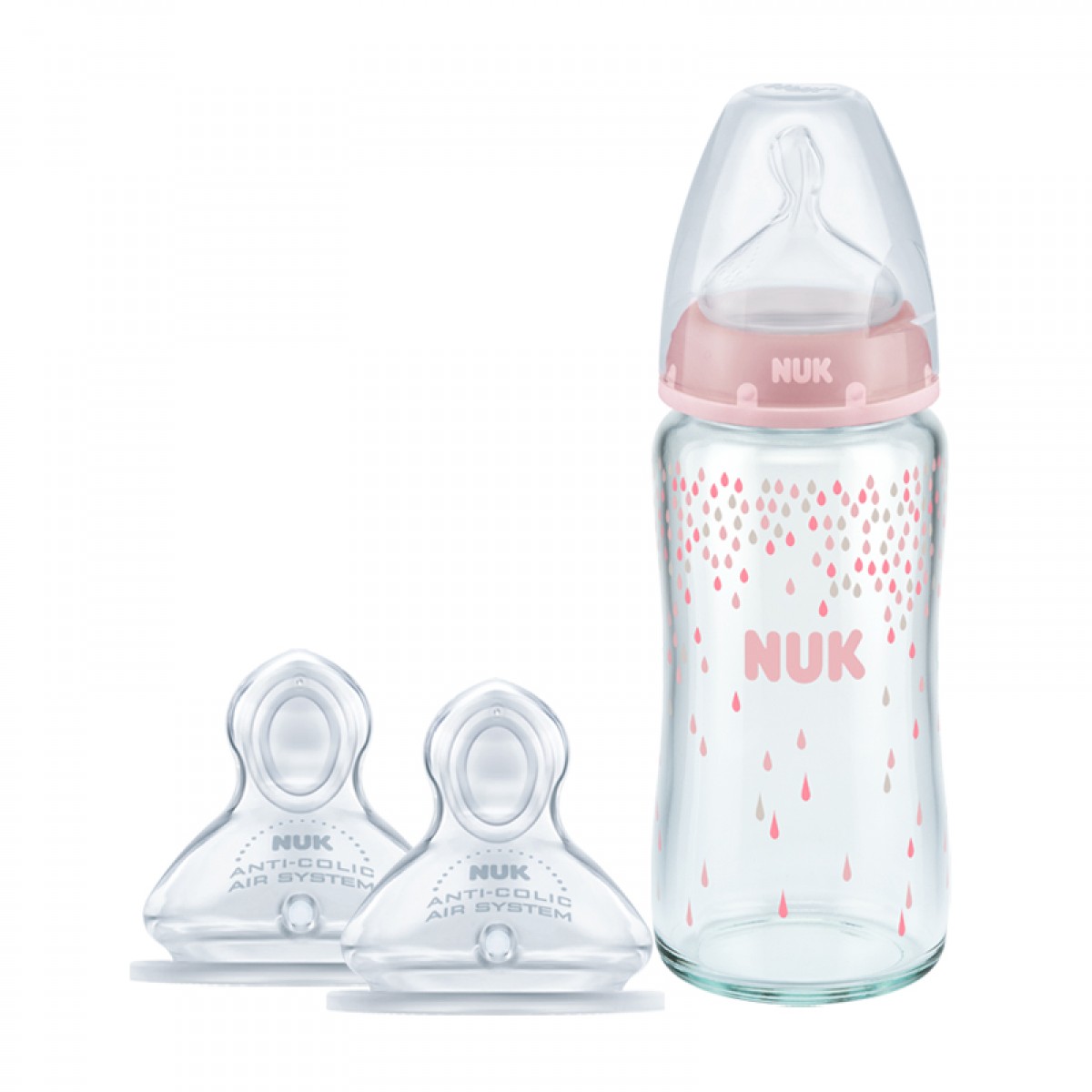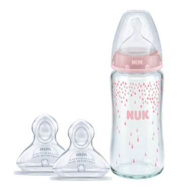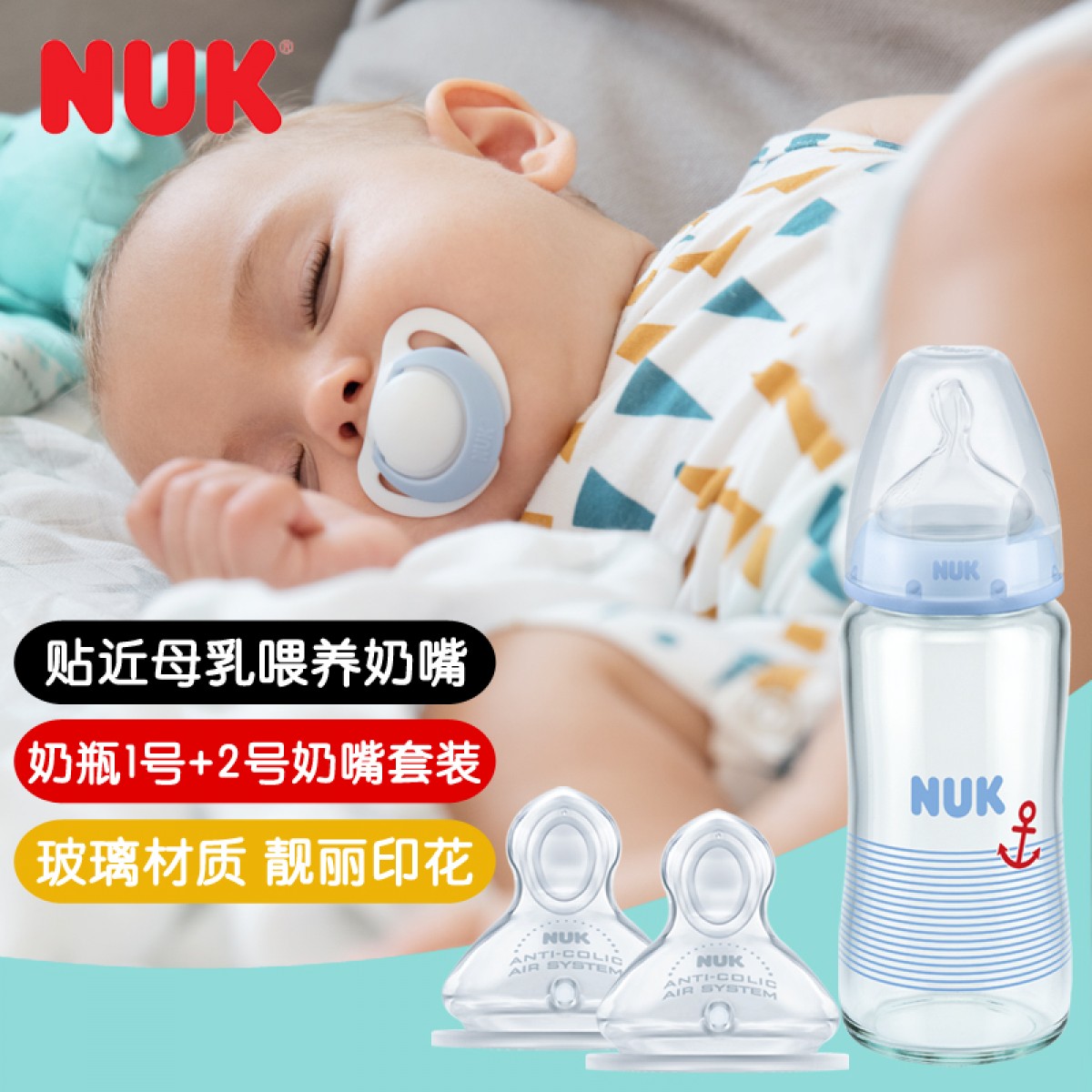 NUK 宽口径240ML玻璃奶瓶1号+2号(6-18个月中圆孔)硅胶奶嘴套装