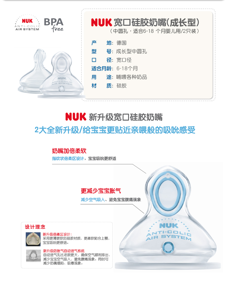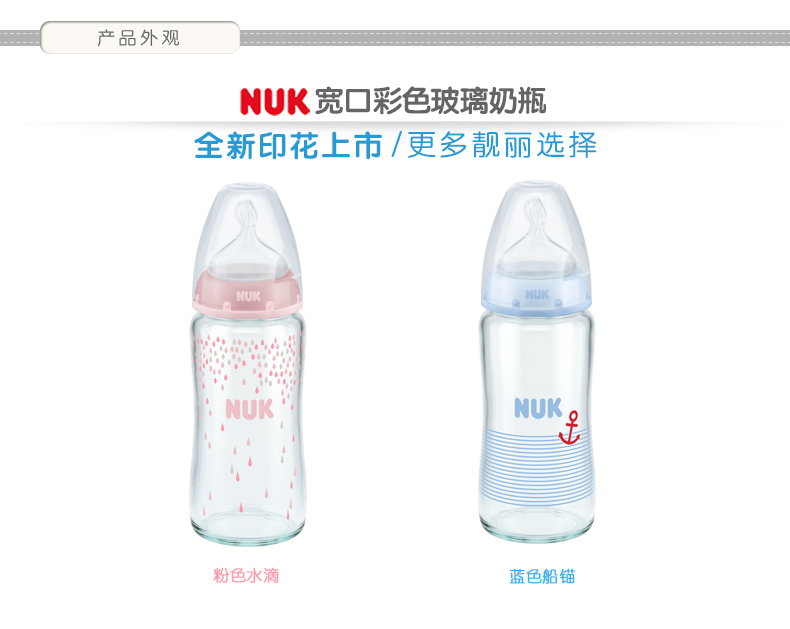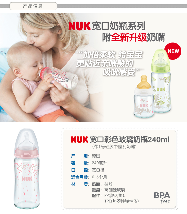 商品名称:NUK 宽口径240ML玻璃奶瓶1号+2号(6-18个月中圆孔)硅胶奶嘴套装