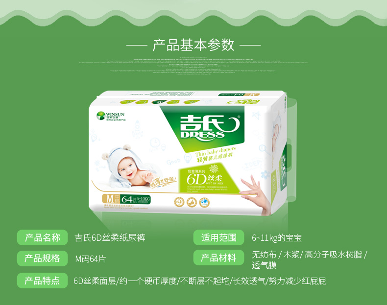 商品名称:吉氏 创意薄6D丝柔纸尿裤M64片新生儿尿裤轻薄透气婴儿中号尿不湿M