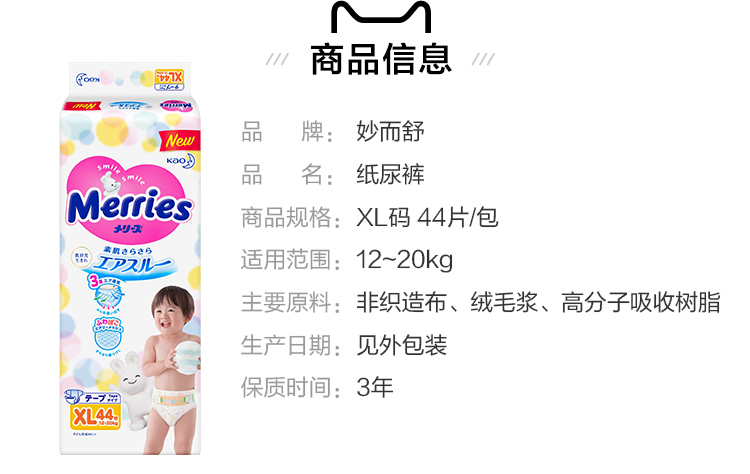 商品名称:花王 日本进口纸尿裤XL44片 超薄透气男女通用婴儿尿不湿