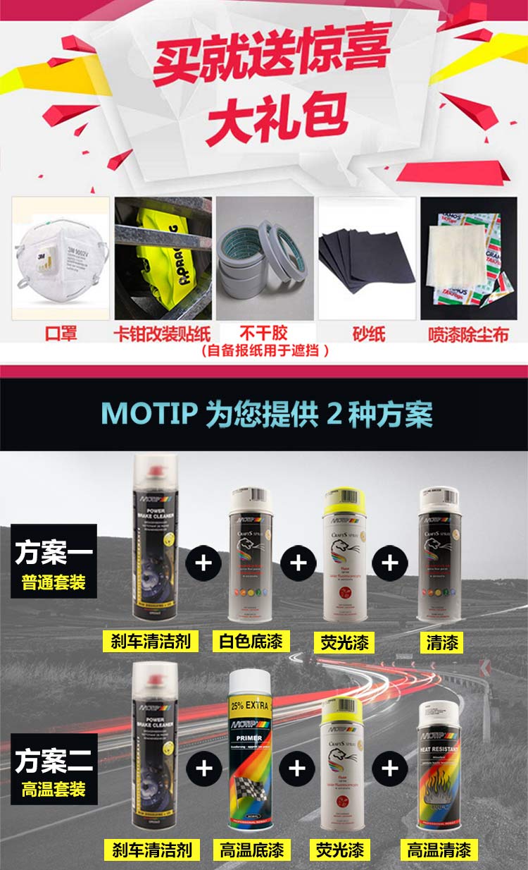 商品名称:MOTIP 汽车荧光卡钳漆防锈手喷漆刹车卡钳改色800度高温漆荧光卡钳套装德国品牌 荧光黄套装