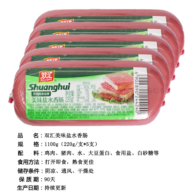 商品名称:双汇 美味盐水香肠220g*5支火腿肠三明治午餐肉方腿切片火锅蛋炒饭