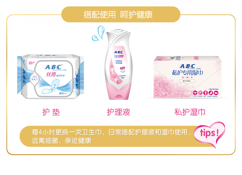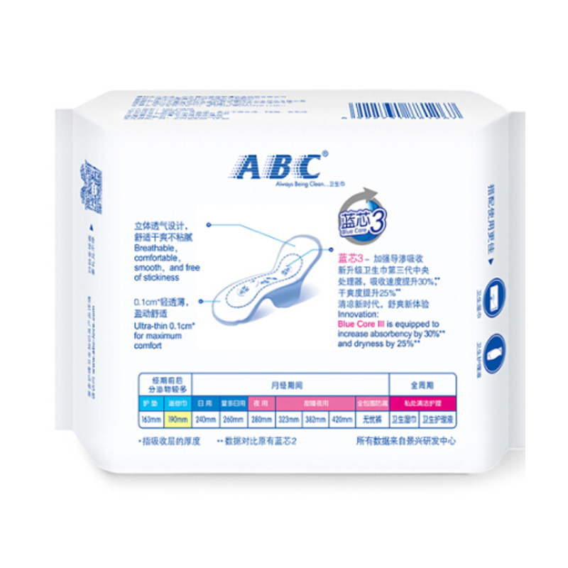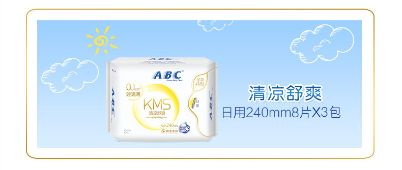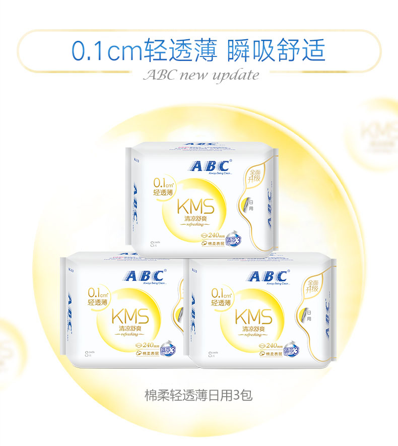 商品名称:ABC 卫生巾超薄0.1cm亲肤日用姨妈巾套装棉柔240mm*3包装