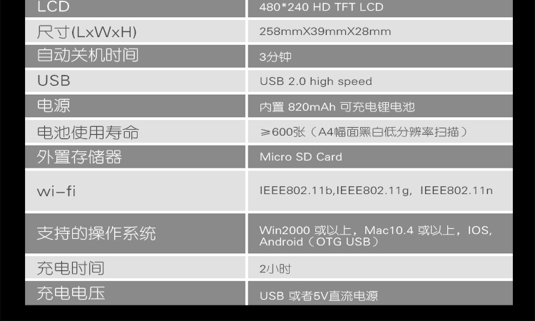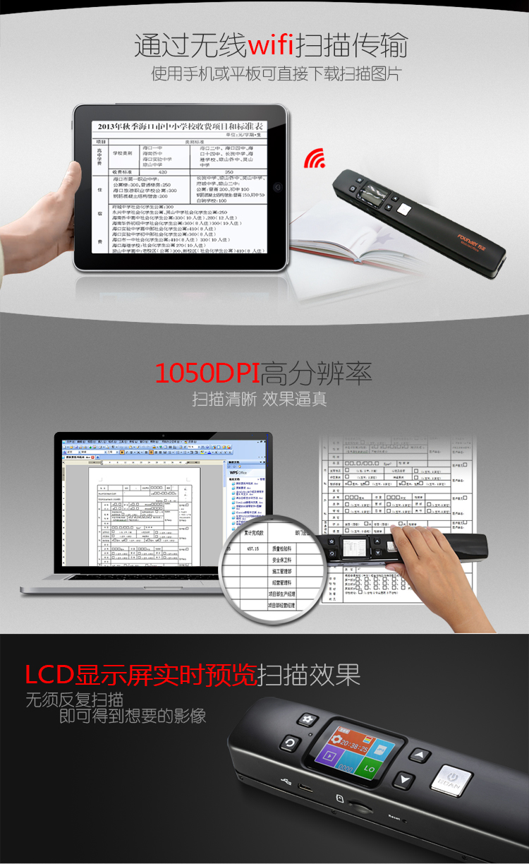 通过无线wifi扫描传输使用手机或平板可直接下载扫描图片,扫描清晰 效果逼真,LCD显示屏实时预览扫描效果。