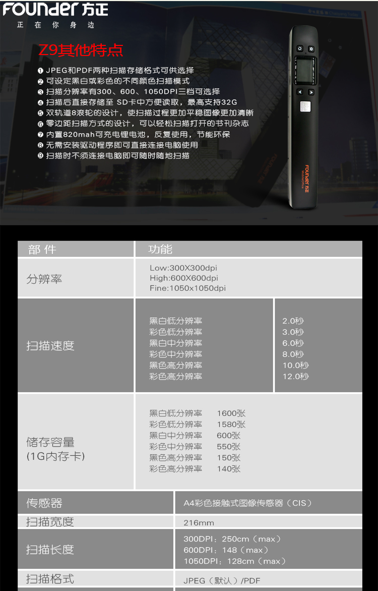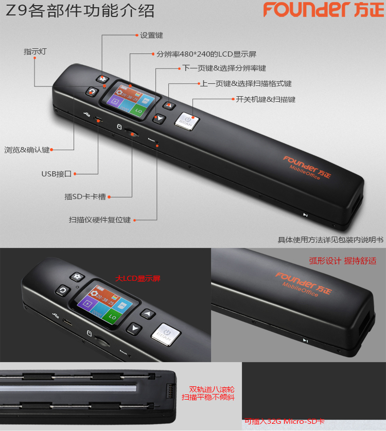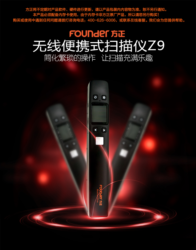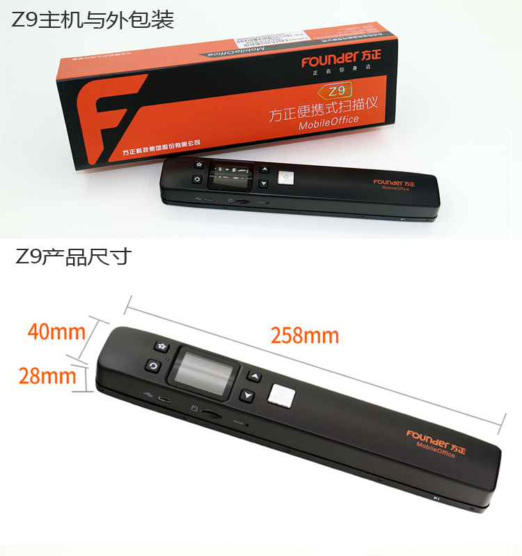 商品名称:方正/Founder 扫描仪A4彩色WIFI无线手持便携式书刊扫描笔 Z9