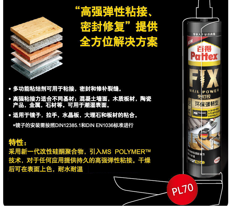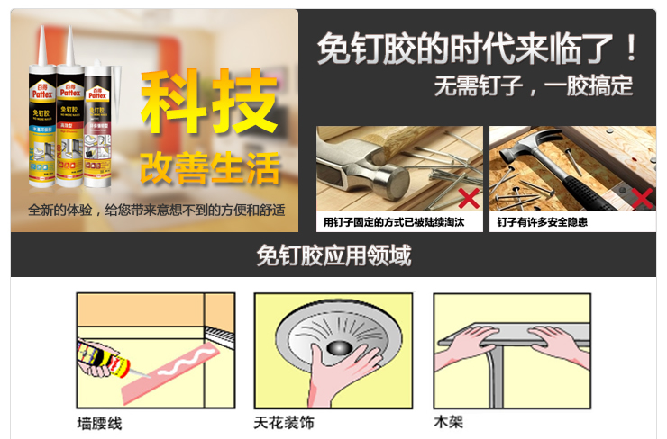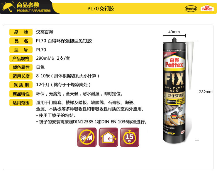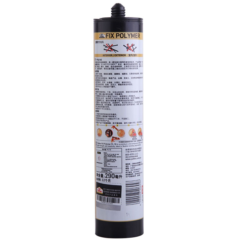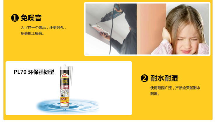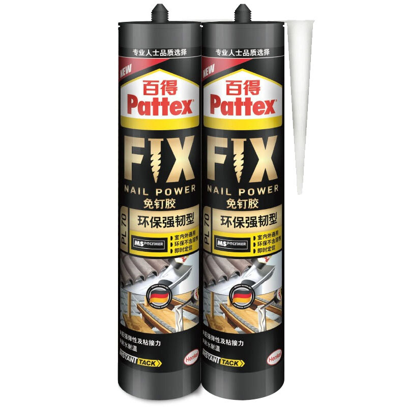 商品名称:汉高百得 免钉胶水 环保强韧型 多用途强力液体钉 室内外通用耐水耐湿 可上色 290ml 2支装 PL70