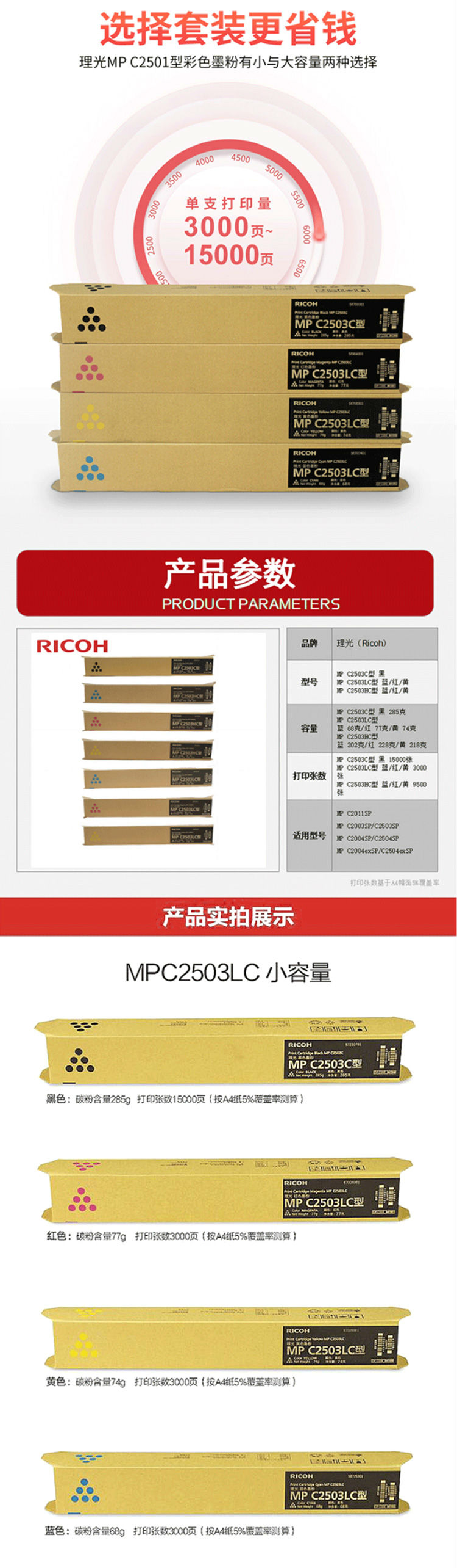 商品名称:★理光/Ricoh 黑色 复印机粉盒 大容量 适用于MPC2011SP/2003SP/2503SP/2004SP/2504SP 打印量15000页 MP C2503C