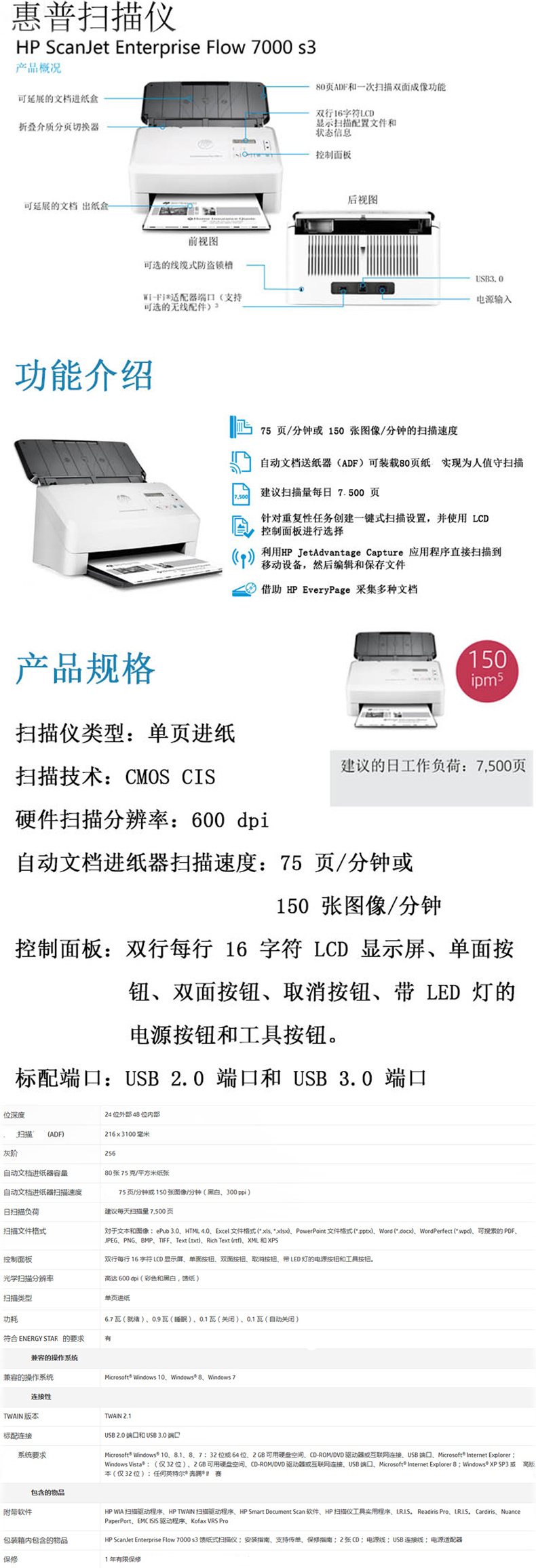 商品名称:★ 惠普/HP ScanJet 7000 S3 A4高速双面馈纸式扫描仪