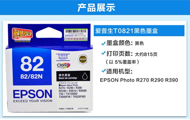 商品名称:★爱普生/Epson T0821 黑色 打印机墨盒 适用于Photo R270 R290 R390 tx820fw 打印量815页
