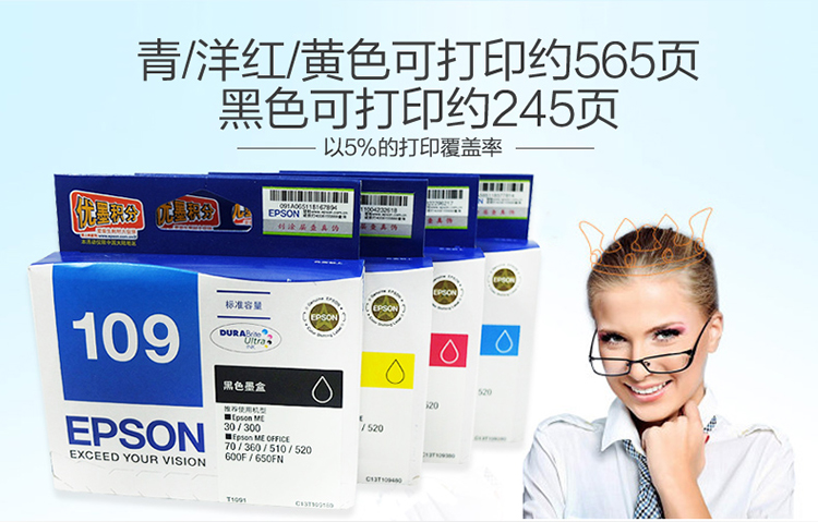 商品名称:★爱普生/Epson T1091BK 黑色墨盒 适用于ME30 300 ME OFFICE 70 ME360 ME510 ME520 600F 650FN 打印量245页
