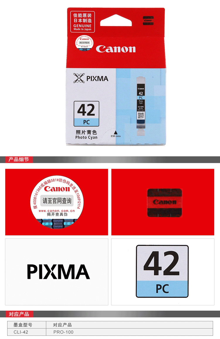 商品名称:★ 佳能/Canon CLI-42PC 照片青色 墨盒 适用于pro-100 可打印量200页