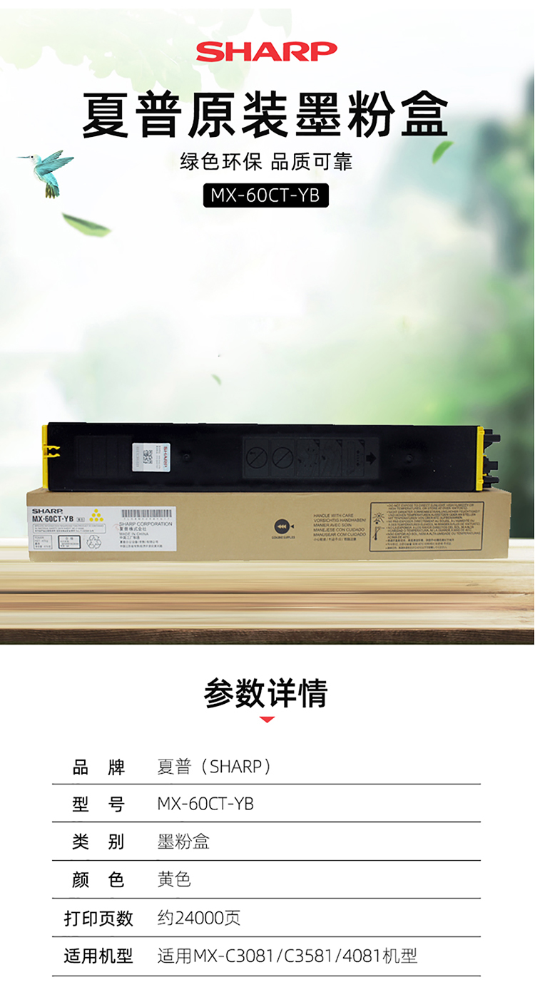 商品名称:★ 夏普/SHARP MX-60CTYA 复印机墨粉盒 大容量 适用于夏普C3081R 黄色 打印量24000页