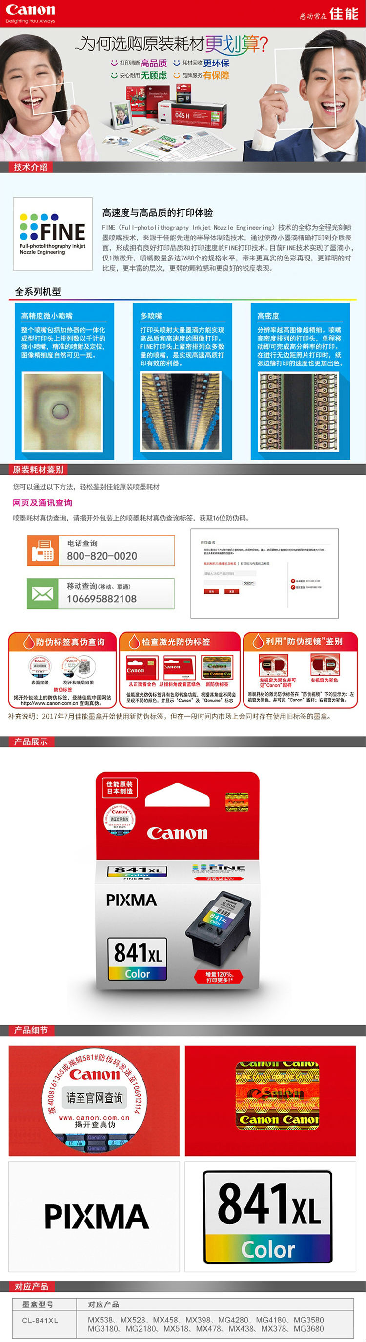 商品名称:★ 佳能/Canon CL-841XL 彩色 大容墨盒 适用于MX538 528 458 398 518 478 438 378 MG4280 4180 3580 3180 2180 3680 打印量400页