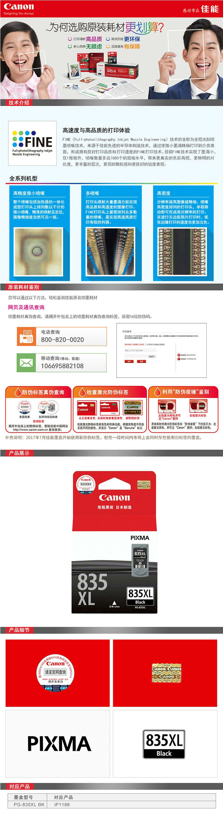 商品名称:★ 佳能/Canon PG-835XL 黑色 大容墨盒 适用IP1188 打印量298页