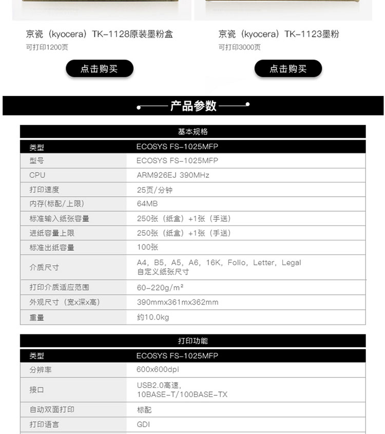 商品名称:★ 京瓷/Kyocera 黑白激光一体机 ECOSYS FS-1025MFP