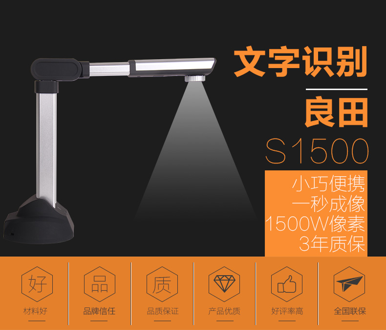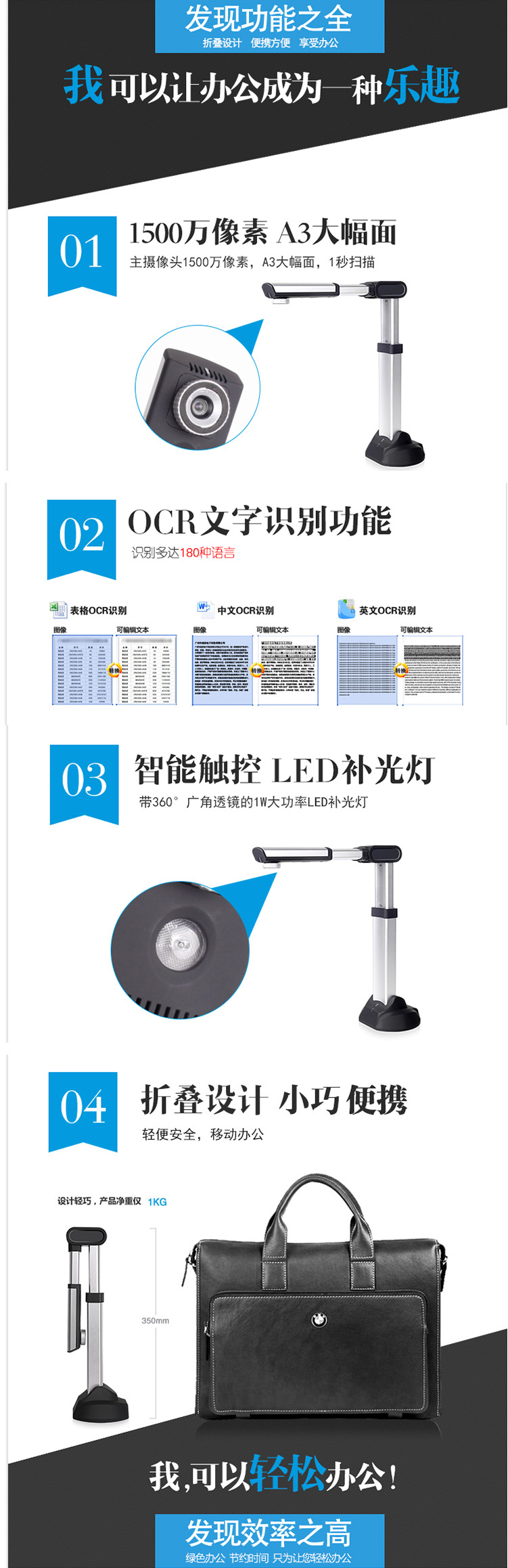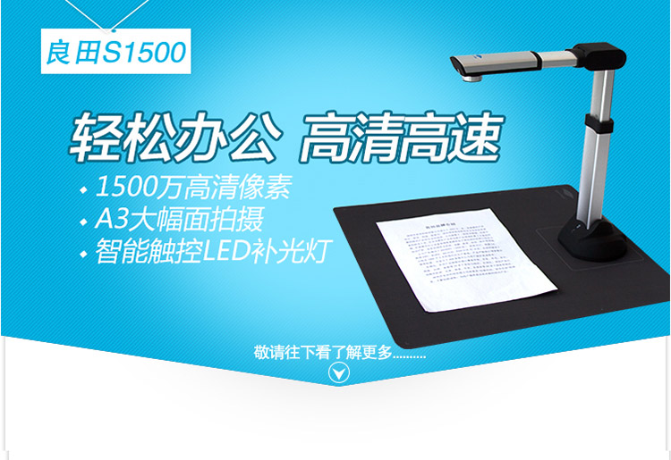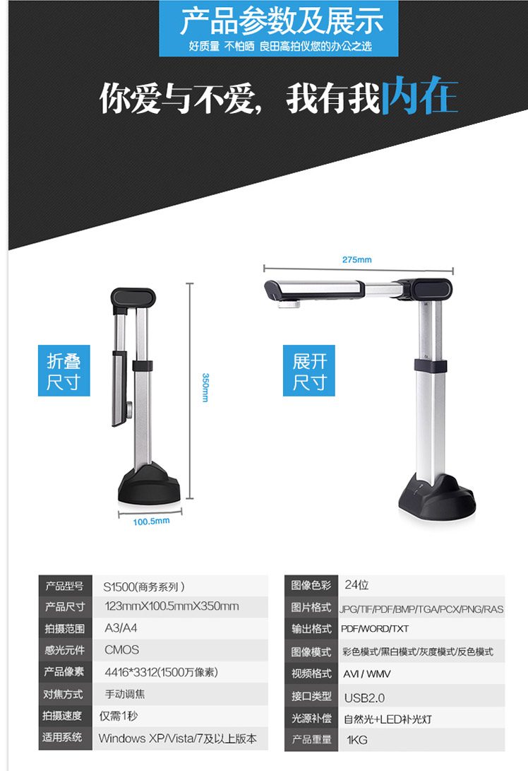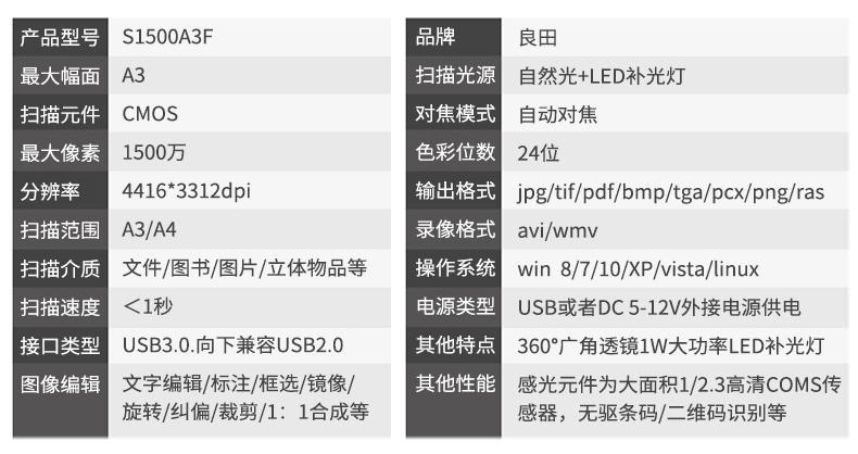 商品名称:★ eloam/良田 S1500A3AF A3幅面高拍仪 1秒/页 可扫描黑白/灰度/彩色 1500万像素 平台式
