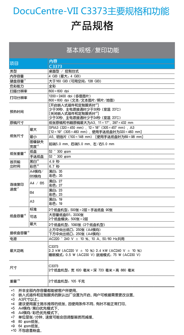 商品名称:富士施乐/Fuji Xerox 复印机(A3彩色激光 标配双纸盒) DocuCentre-VII C3373 CPS