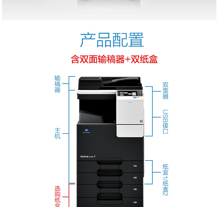 商品名称:柯尼卡美能达/KONICA MINOLTA A3彩色数码复印机 (标配自动双面送稿器、标配双纸盒) 黑色 bizhub C226
