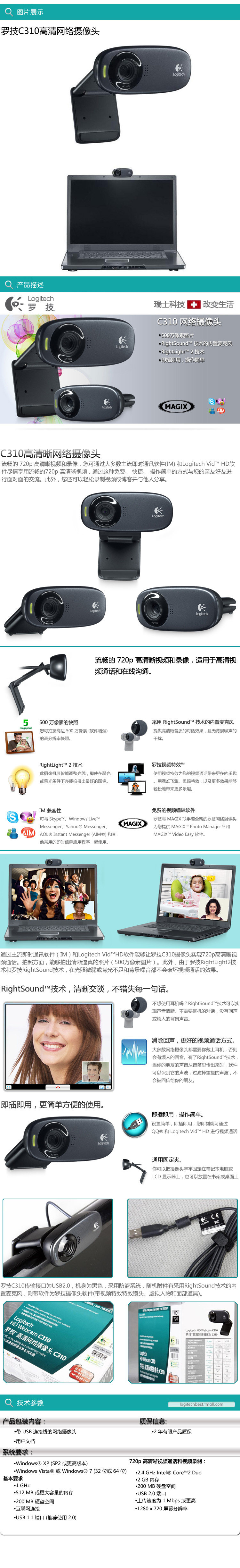 商品名称:罗技 高清晰网络摄像头 黑 C310
