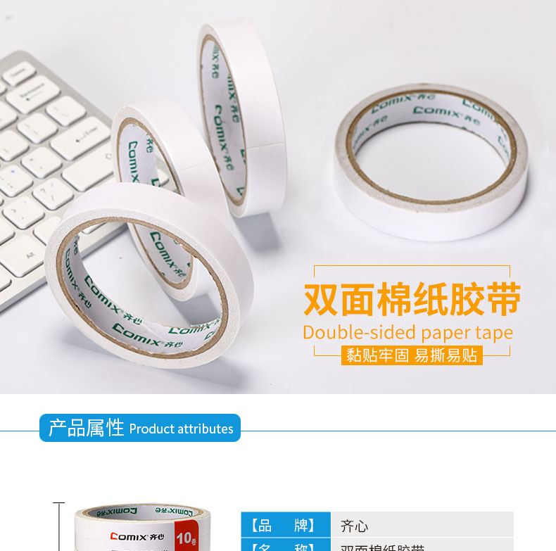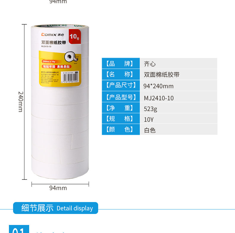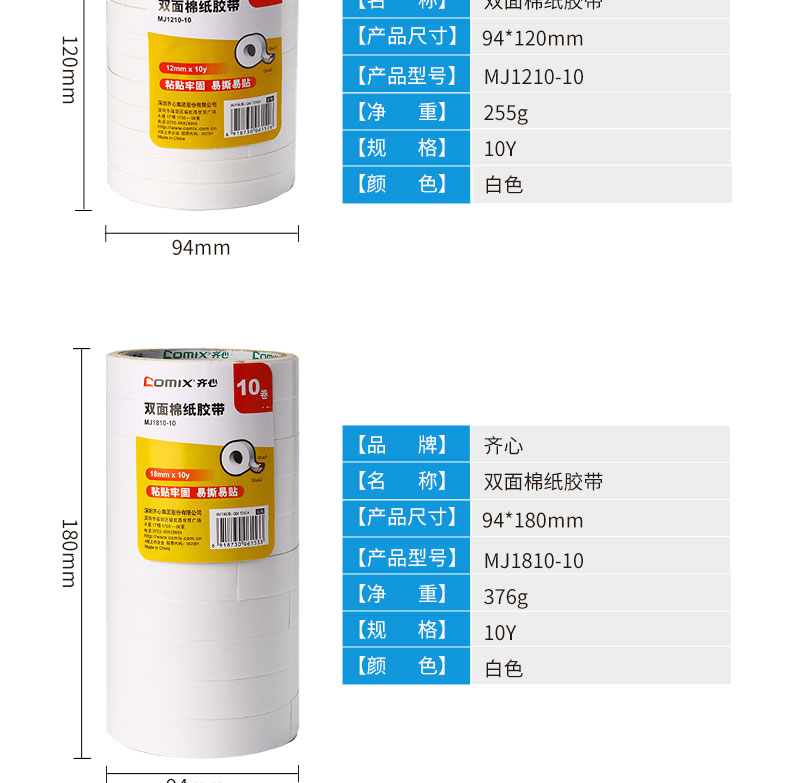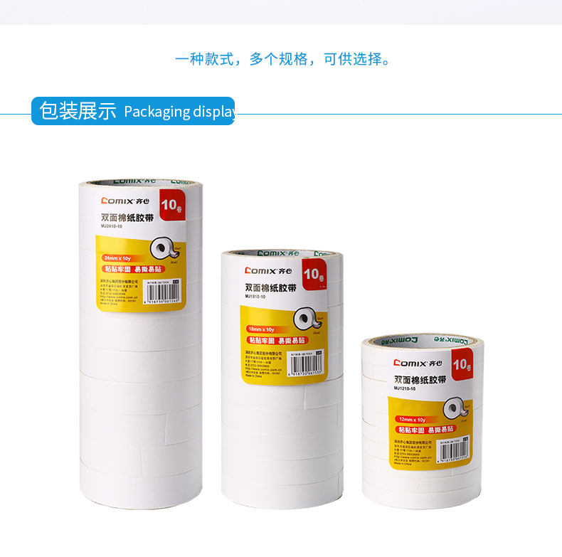 商品名称:齐心 双面棉纸胶带 18mm*10y 白色 10卷装 MJ1810-10