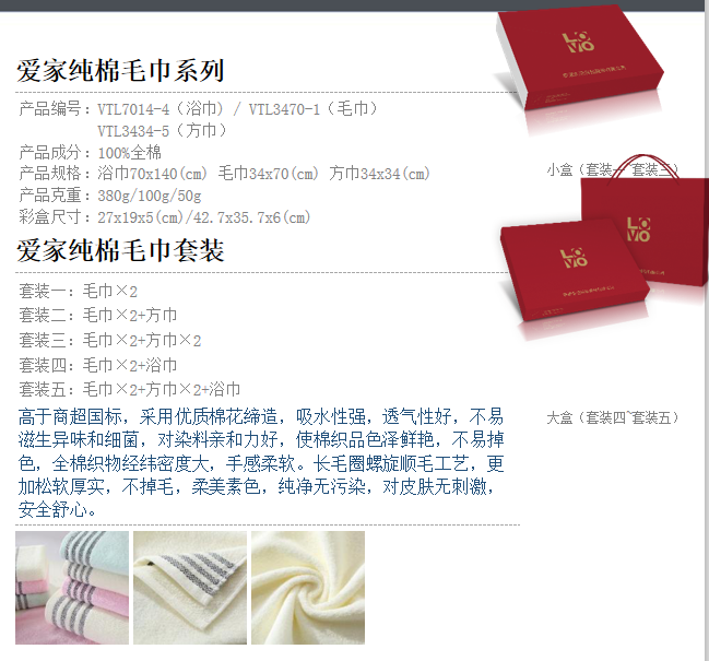 商品名称:LOVO 爱家 纯棉毛巾系列 毛巾×2+方巾 VTL3470-1