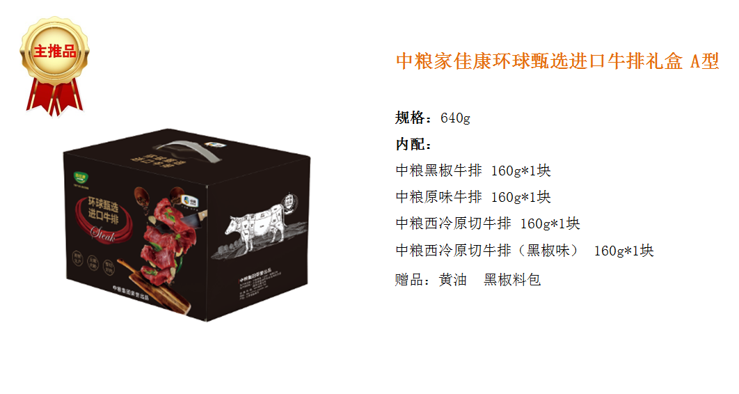 商品名称:中粮 家佳康环球甄选进口牛排礼盒 A型 640g