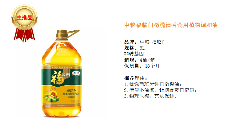 商品名称:中粮 福临门橄榄清香食用植物调和油 5L