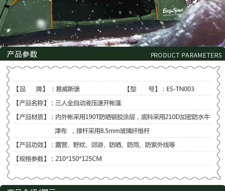 商品名称:易威斯堡 三人全自动液压速开帐篷 ES-TN003